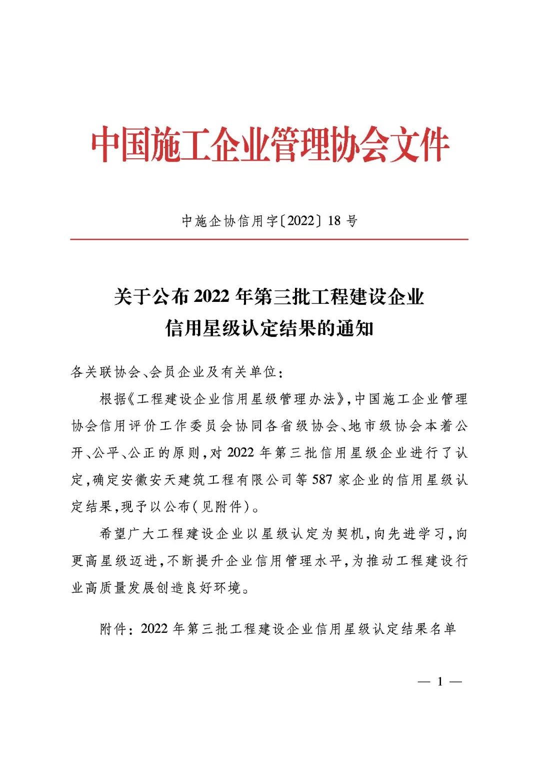 近日,中国施工企业管理协会公布2022年度第三批工程建设企业信用星级认定结果,工口 凭借良好的企业履约行为和信用表现,再次顺利通过中国施工企业管理协会考核认定,并晋升为6星信用企业。